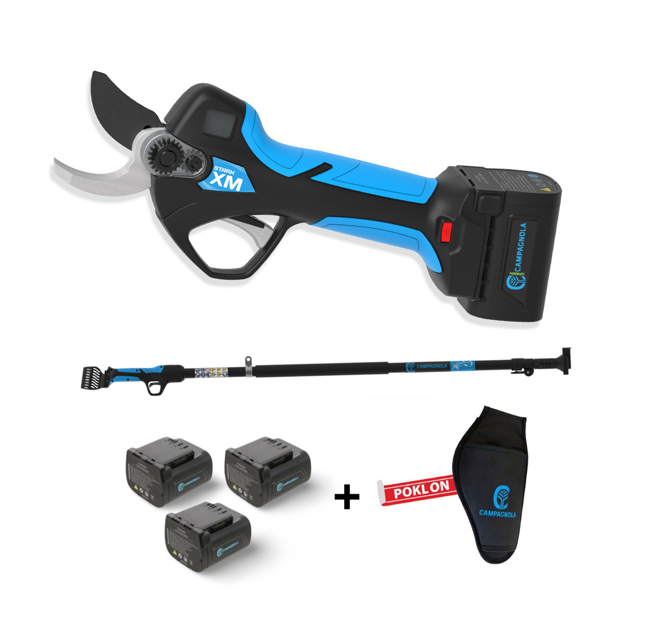 Aku škare STARK XM s progresivnim rezom izvode čiste i precizne rezove, ostavljajući vrlo glatke površine. Dolaze s teleskopskim produžetkom 150-230 cm koji nije fiksan te se može montirati i skinuti po potrebi. Tako se škare mogu koristiti za rezanje držanjem u ruci ili uz produžetak. Zbog male težine i ergonomske ručke izrazito su učinkovite prilikom rezidbe vinograda, voćnjaka, maslinika, parkova i nasada. Motor škara je bez četkica, a otvor oštrice od 58 mm omogućuje rezove do promjera 35 mm, s preko 80 rezova u minuti. Autonomija rada jedne baterije 2,5 Ah je 2/3 sata, te sa dobivene 3 baterije u kompletu jamče cijelodnevnu rezidbu. Punjač istovremeno može puniti 3 baterije te je vrijeme punjenja istih 1,5 h. Oštrice su izrađene od vrlo otpornog čelika i rade čiste i precizne rezove. Opremljene su sa električnim sustavom podešavanja reza (otvaranje oštrice 70% i puni rez 100%) čime je znatno dobivena ušteda na vremenu prilikom rezanja tanjih grana. Škare STARK XM opremljene su LCD zaslonom pomoću kojeg je vidljiv napravljen broj rezova i preostali kapacitet baterije. Škare su opremljene zaštitnim senzorom koji štiti korisnika od ozljeda prilikom rada. Škare imaju funkciju okidač s brzom promjenom otvaranja oštrice (patent Campagnola). KOMPLET SADRŽI: 3 baterije 2.5 Ah, teleskopski produžetak 150-230 cm, punjač baterija s tri izlaza, brusni kamen za oštricu, futrolu i kofer.